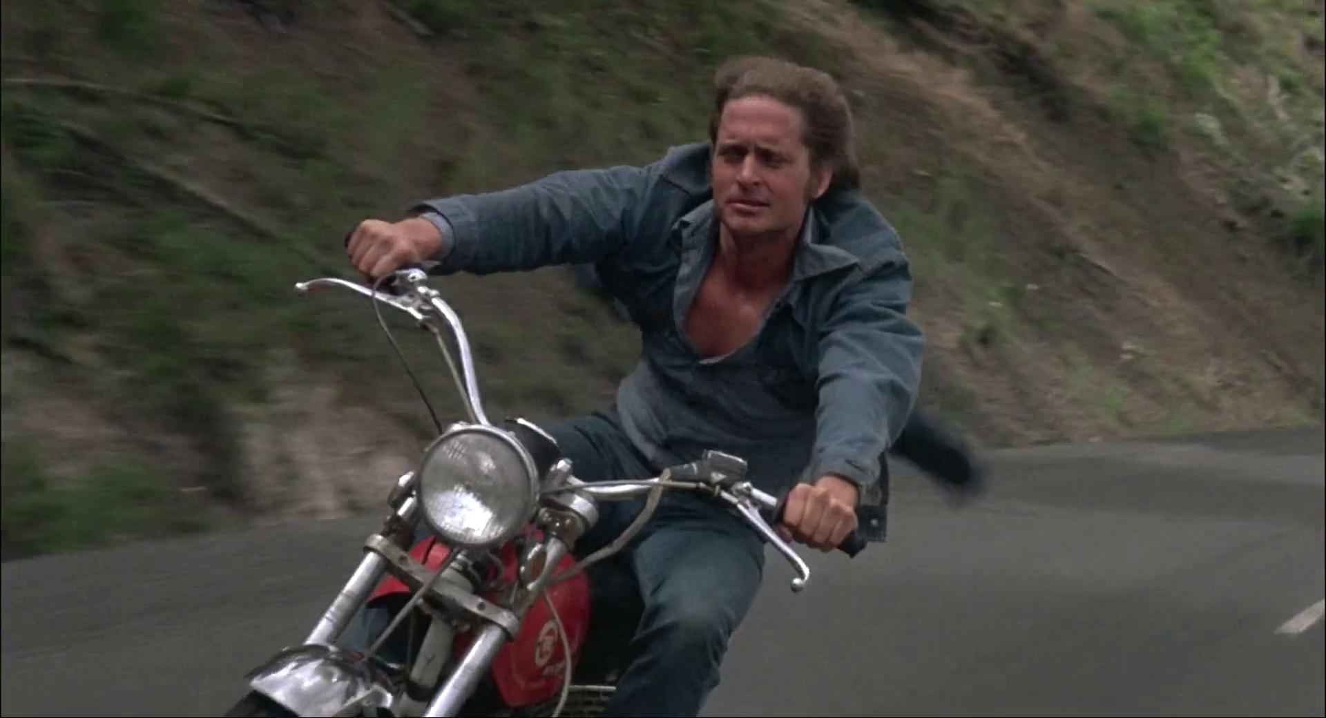 This is easily the weakest third from a basic standpoint of logic, as the goat fields Danny is tending are supposed to be out in the middle of nowhere but every Oregon workman with a hard hat is right there on that wild mountain road as increasingly unbelievable obstacles. It doesn’t help that these police cars are just cars with signs saying POLICE stuck on their sides. Douglas’s stunt double has unmoving hair too.